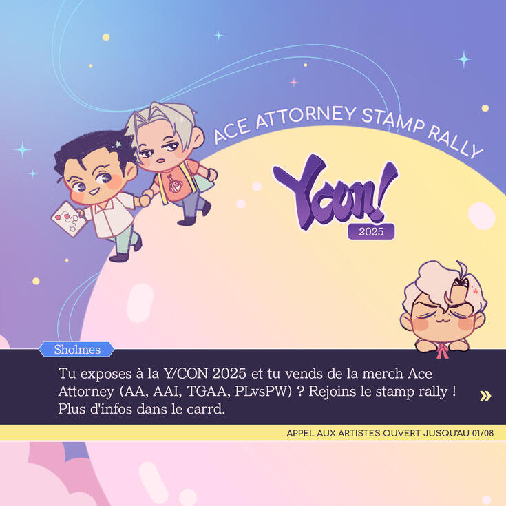 Tu es un artiste exposant à la Y/CON 2025 (15 & 16 nov) et tu vends de la merch Ace Attorney (AA, AAI, TGAA, PLvsPW) ? Rejoins le stamp rally !Planning19/07/25 :